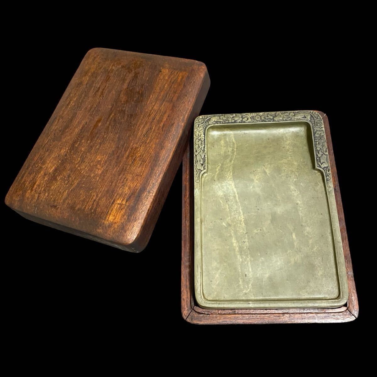 - 緑端渓硯 昇龍紋 木箱付 7吋 緑石硯 登り龍 竜? 獅子? 縁彫 古硯 古端渓 唐硯 唐物 文房四宝 中国古玩 書道具 文房具 中国 美術 骨董品