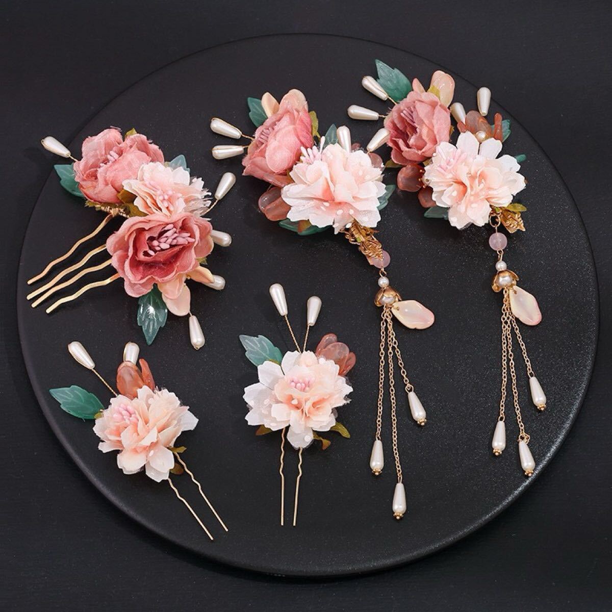 - 簪(かんざし) 簪 髪飾り やえざくら(八重桜)4点セット 髪飾り 着物 和服 和装 成人式 卒業式 つまみ細工 結婚式 和装小物