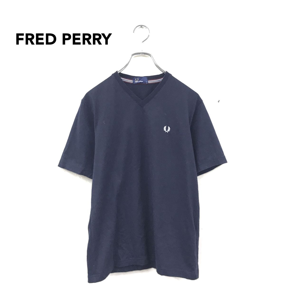 > 2K2405-T◆FRED PERRY フレッドペリー 半袖Tシャツ カットソー ブイネック 刺繍ロゴ◆sizeS ネイビー メンズ トップス コットン100
