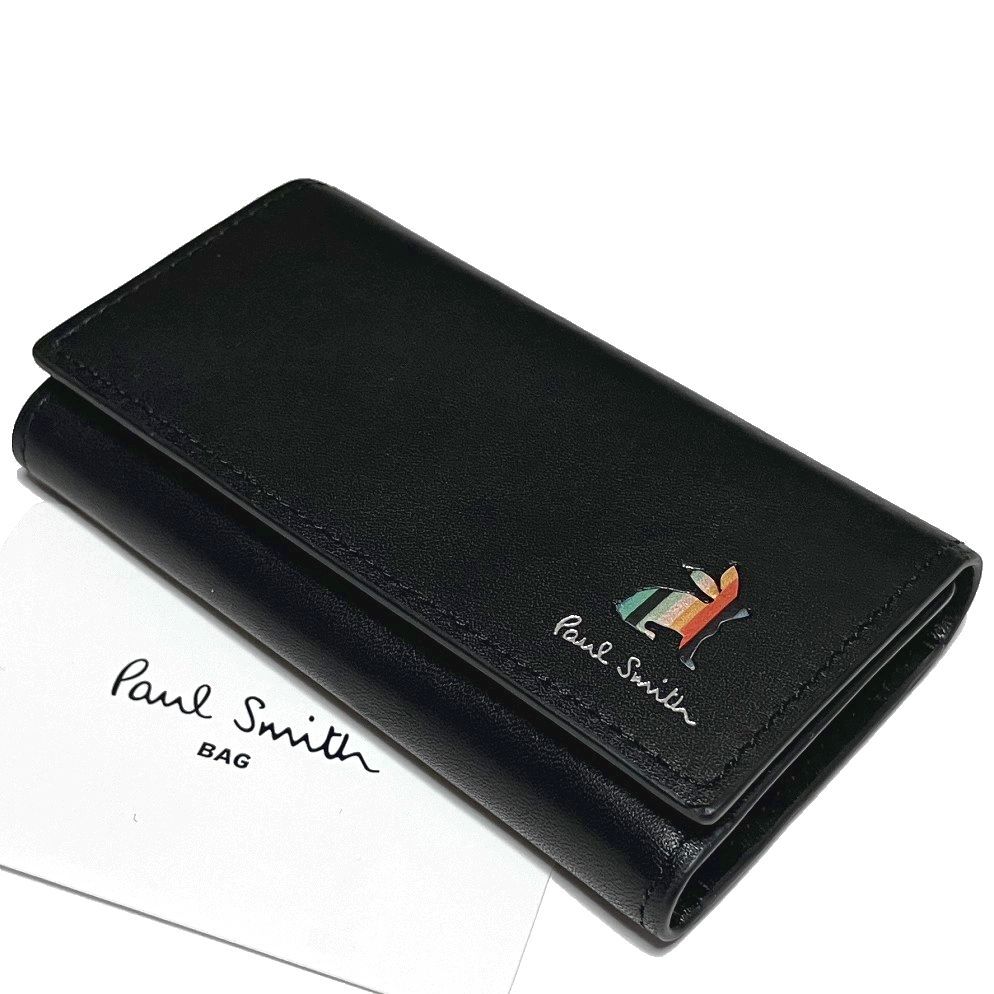 - 未使用 Paul Smith ポール スミス マーケトリーストライプ ラビット レザー 三つ折り 4連 キーケース ブラック 牛革 定価17,050円