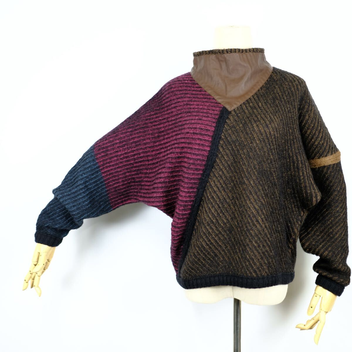 - 1970s イタリア製 ビンテージ ドルマンスリーブ パッチワークニットセーター ユーロ 古着屋 オーバーサイズ イッセイミヤケ好きに