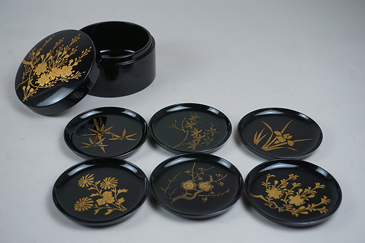 - ■ks848■茶道具 小振り木製漆器 黒塗蒔絵 絵変わり菓子皿(銘々皿) 古漆器