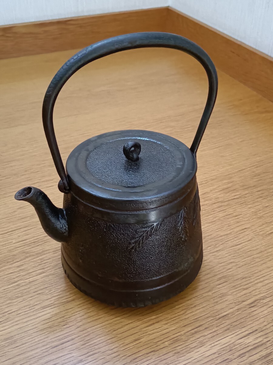- 鉄瓶 鋳鉄 金属工芸品 鉄びん筒型 煎茶道具 時代金工 伝統工芸品 柳とカエル意匠 山川堂 古美術品 骨董品 茶道具 昭和レトロ アンティーク