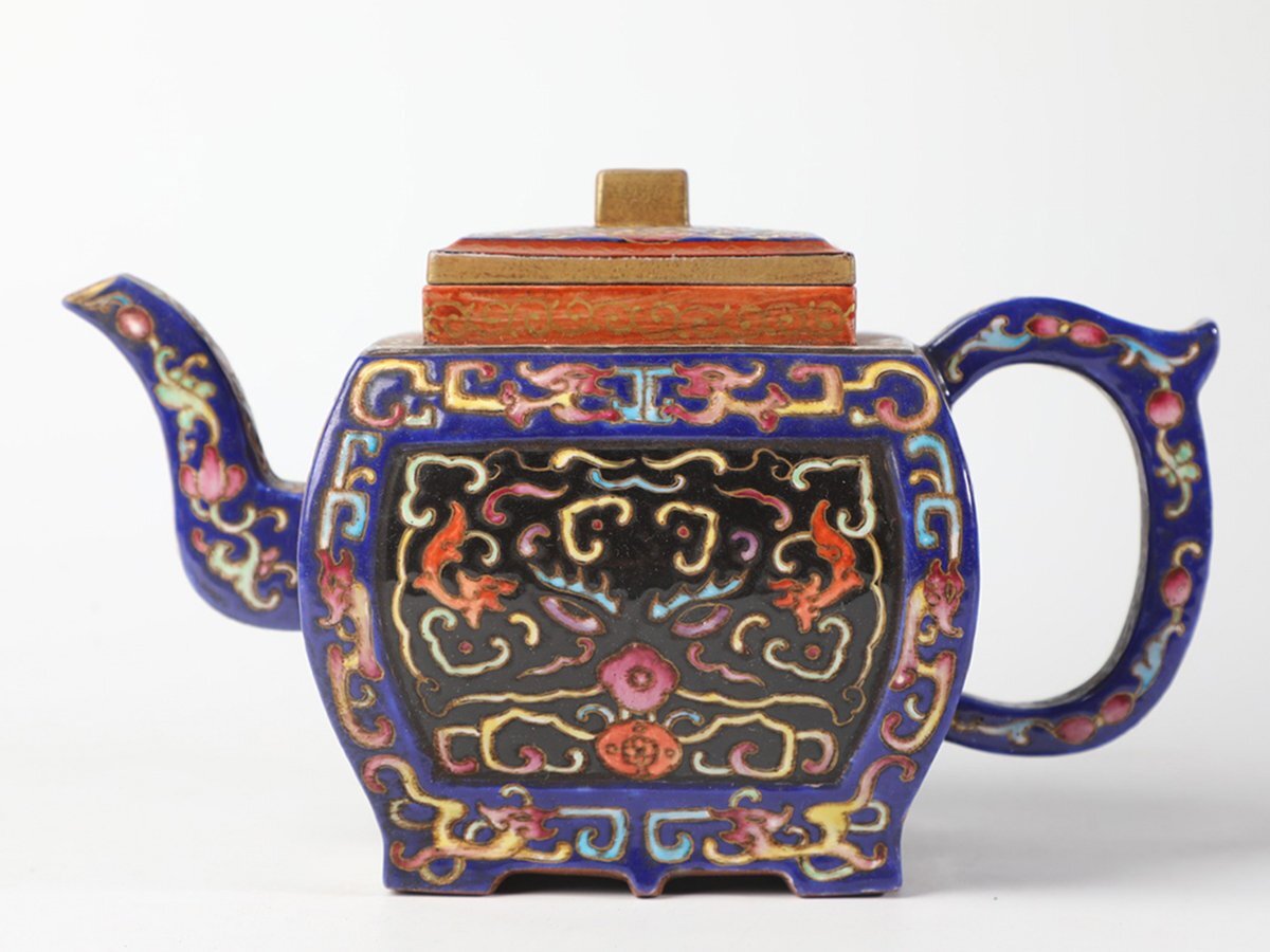 > ■大成美術■乾隆御製款 琺瑯彩瑞獣紋紫砂急須 箱付き(検)清時代 急須 紫砂茶壺 茶道具 唐物 中国美術 骨董 288