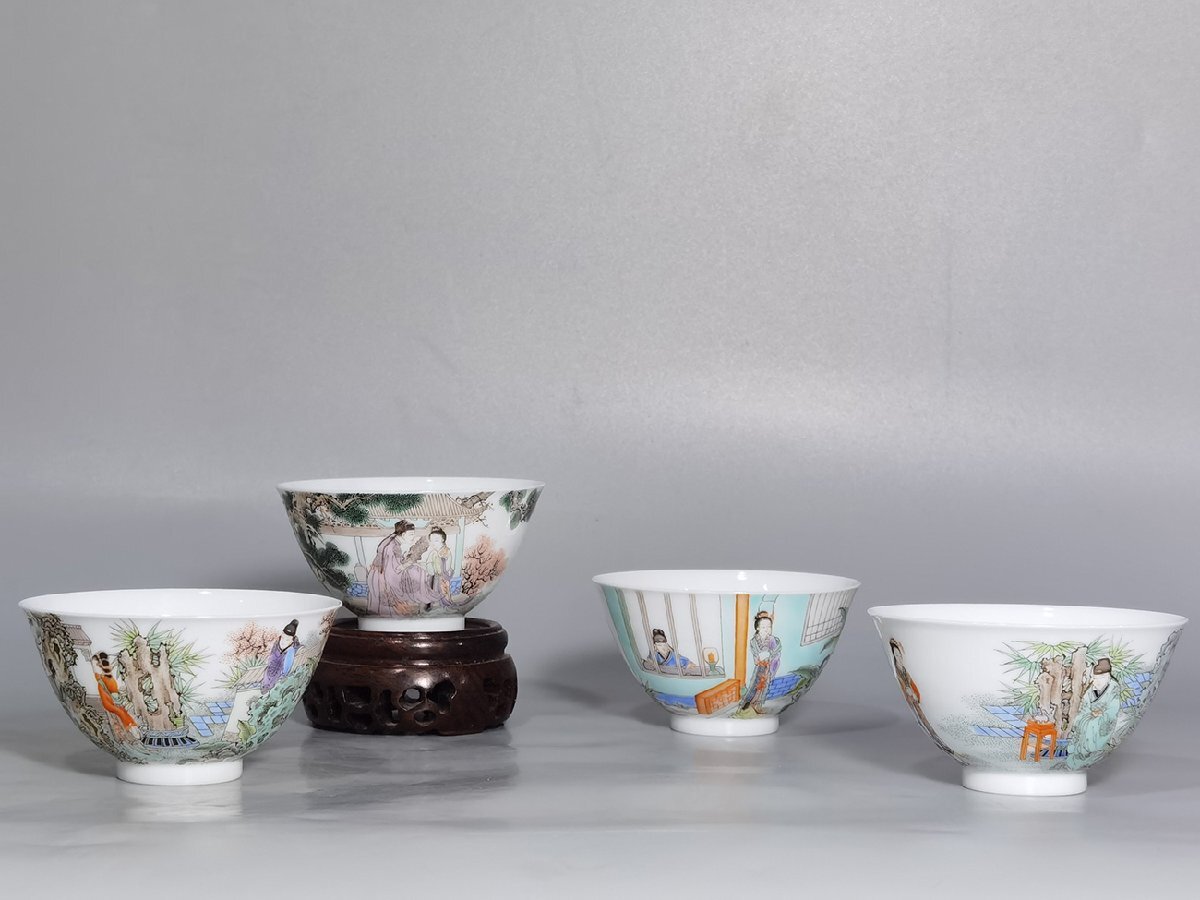 - 【安】清時代 乾隆年製 粉彩西廂記図内暗刻龍紋杯セット 4点 唐瓷 古陶瓷 中国古美術 古董品 307
