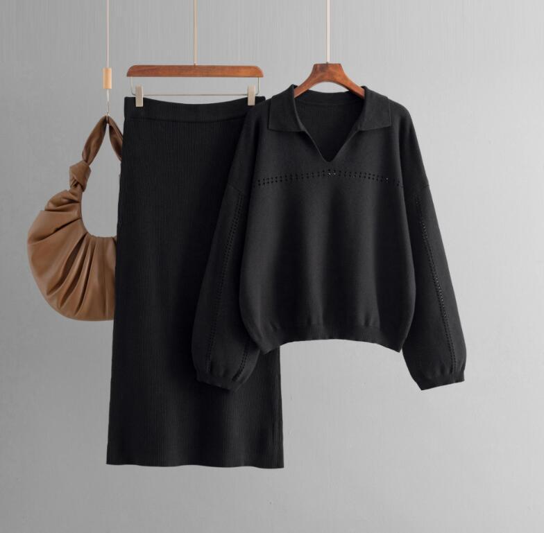 - 346 スカートスーツladiesレディース ◇ 秋冬 上質 ◇ 暖かい 厚手 ニット素材 ブラック