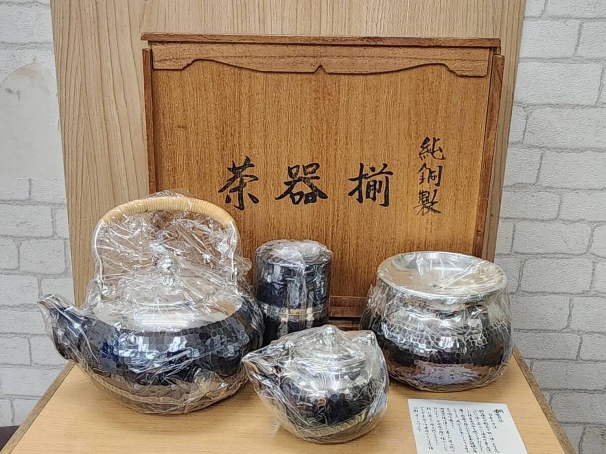 - M ☆★ R70923 未使用 開新堂 純銅製 燻銀銅製 茶器揃 急須 鎚目茶筒 建水 湯沸 茶托 5客 五点組 共箱 茶道具 ☆★