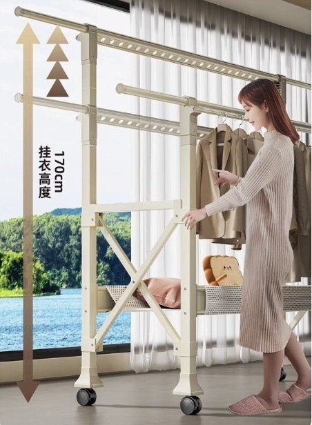 - 室内用アルミ合金伸縮式折りたたみ洗濯物干しスタンド、ベランダ・屋外用晒し布団干し神器