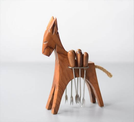 > ドイツから 古い木製のフルーツピック6本とロバのスタンドセット ウッドカクテルフォーク ヴィンテージ アンティーク it4029