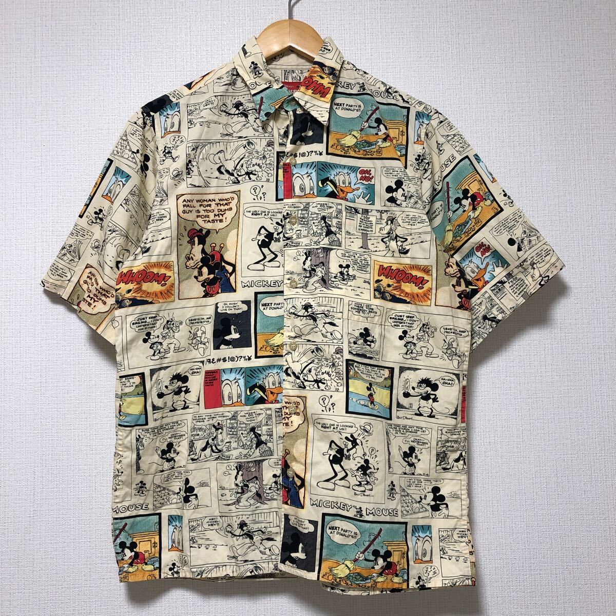 - (k) MICKEY MOUSE × Reyn Spooner ミッキーマウス レインスプーナー 総柄 ハワイ製 フルオープン 半袖 アロハシャツ XS ベージュ コットン
