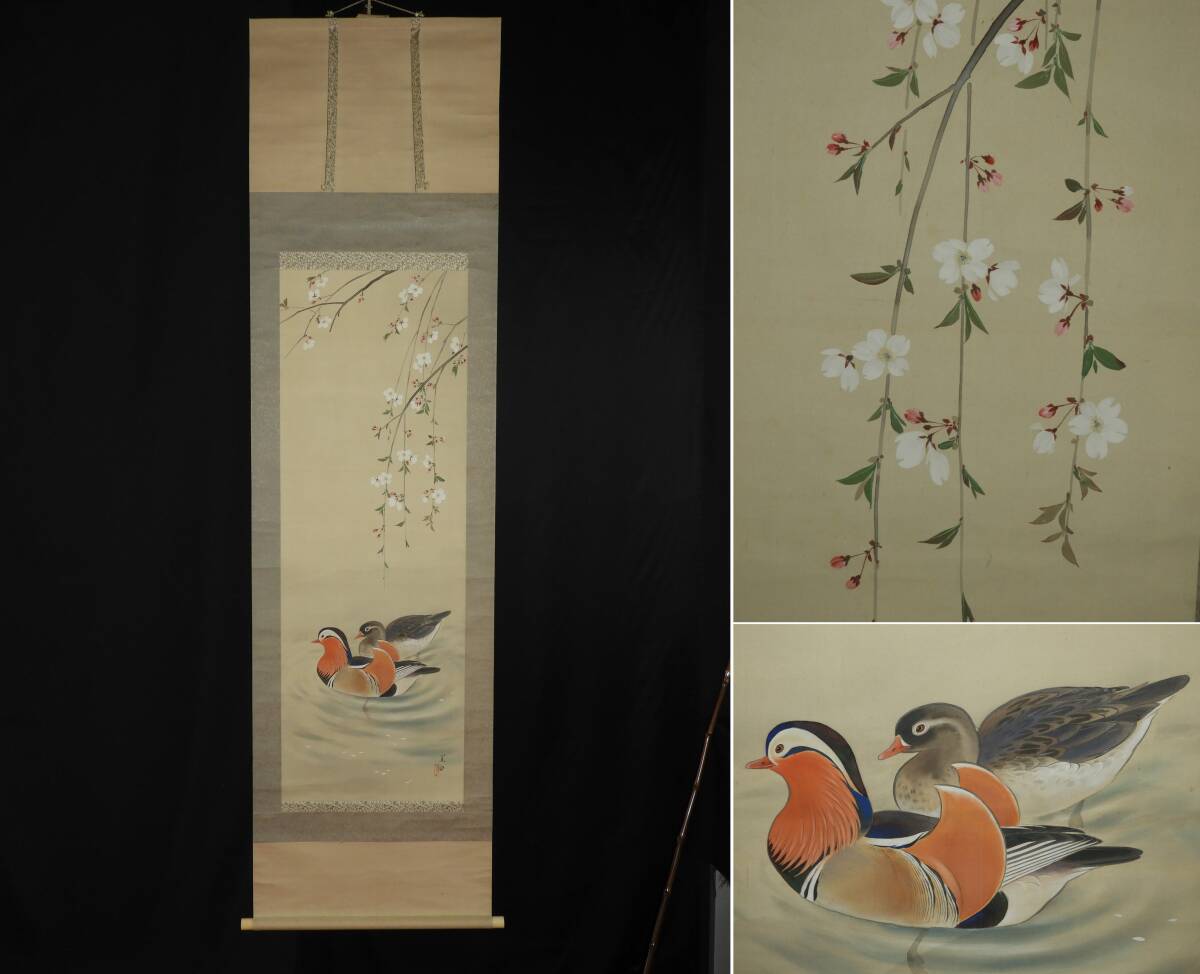 - 真作 本田蕉風(桜下おしどりの図)絹本 合せ箱 掛軸 真筆保証 肉筆保証 骨董 絵画 書 古物