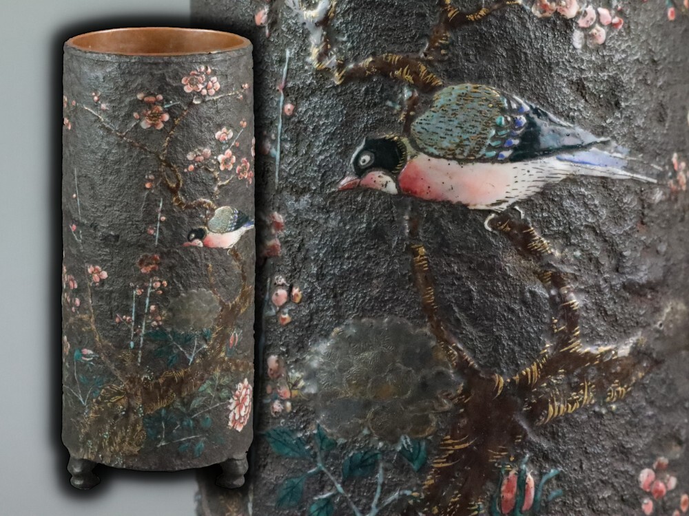 > 超絶技巧 鉄地 鉄製 古鉄 七宝細工 エナメル彩 梅花 鶯 花鳥図 金銅 草花紋 高肉象嵌 花瓶 / 花器 時代物 骨董品 古美術品 / 高さ29,2cm