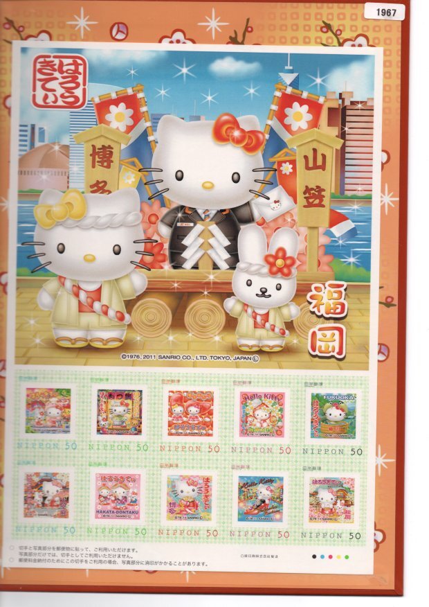 > 1967★フレーム切手 ご当地キティ 福岡限定 はろうきてぃ ハローキティ ハンドタオル カード付 50円x10★
