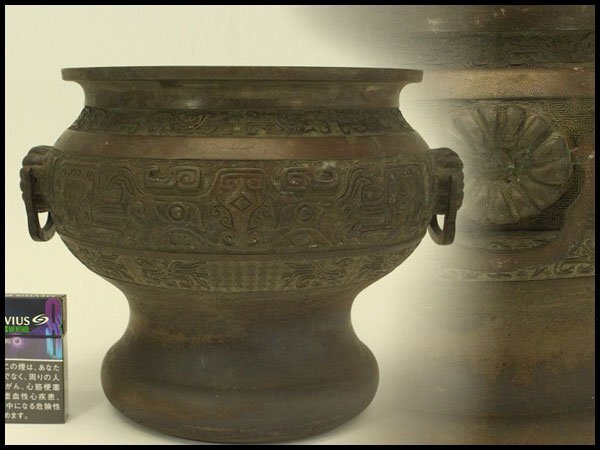 - 【銀閣】古銅 饕餮紋 瓶掛 火鉢 手炙り 時代物 旧家蔵出 送料無料(A731)