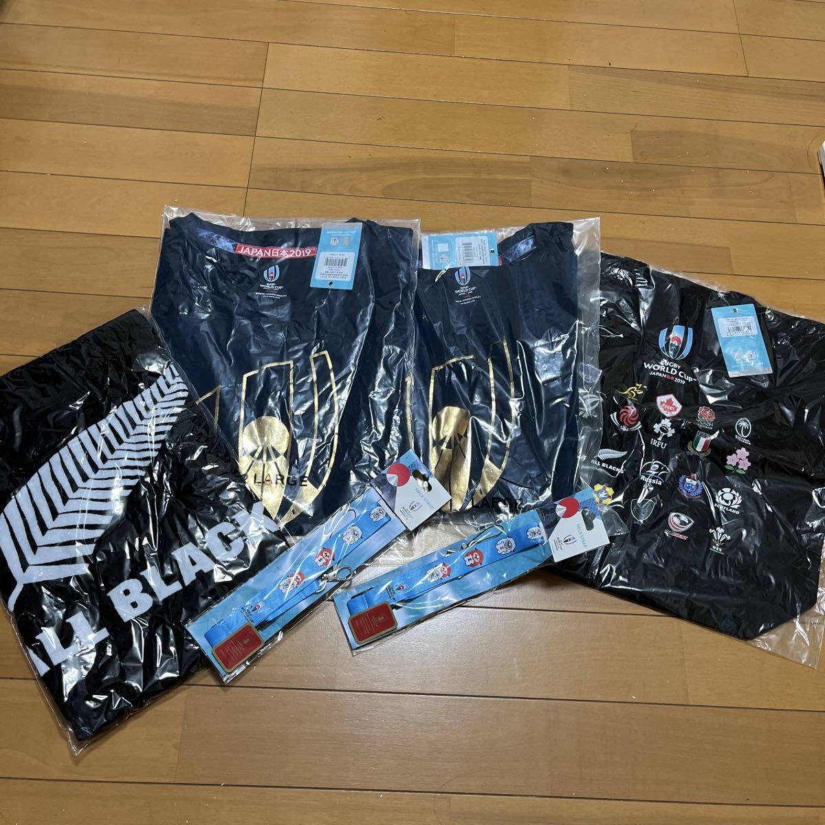 > 0300 ラグビーワールドカップ2019公式グッズ Tシャツ2枚 オールブラックス タオル トートバッグ ストラップ2つ