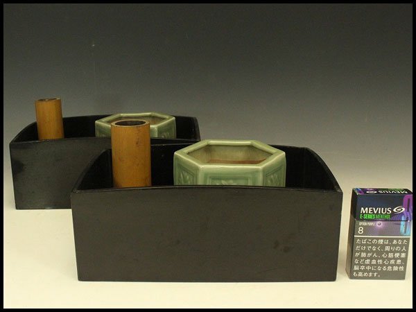> 【銀閣】茶道具 六角 青磁 火入 煙草盆 一対 江戸末期-明治 旧家蔵出 送料無料(A258)