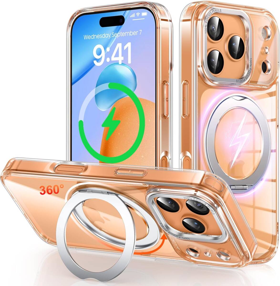 > iPhone 17 Pro 用 ケース Magsafe対応 ワイヤレス充電 360°回転スタンド 縦横両対応