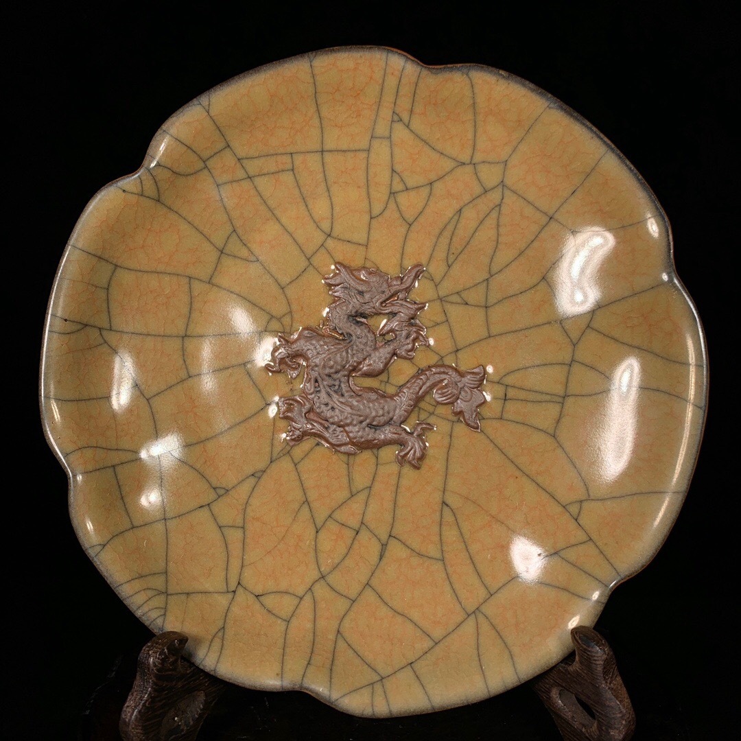- 蔵友旧蔵出 宋 哥窯 冰裂紋 龍紋 花口盤 稀少珍品 貴重品 古陶瓷品 置物 古賞物 中国古玩 中国古美術品