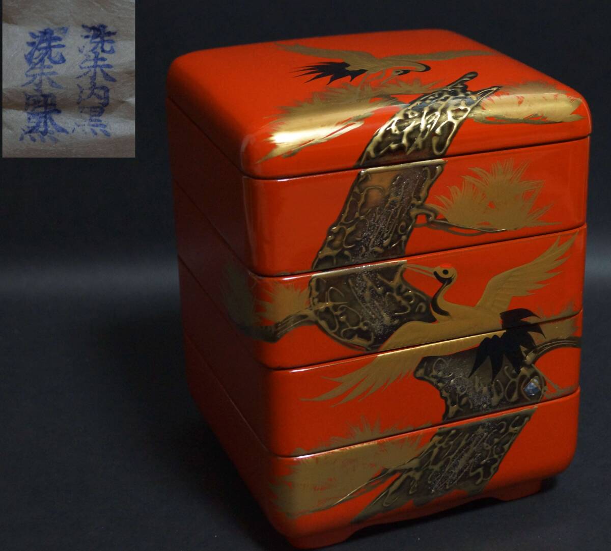 - 【閑】会津塗 木製 洗朱内黒 金蒔絵『鶴松文』螺鈿象嵌 四段重 重箱 / 懐石道具 7C0925 ■