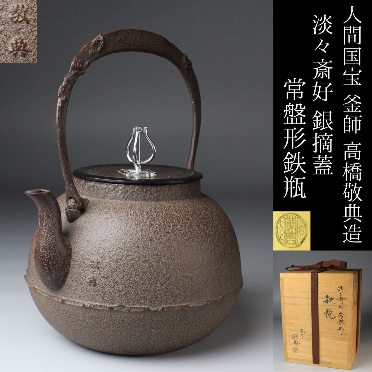 > 【LIG】人間国宝 釜師 高橋敬典造 淡々斎好 銀摘蓋 常盤形鉄瓶 共箱 共布 栞 茶道具 旧家収蔵品[.YE]25.09
