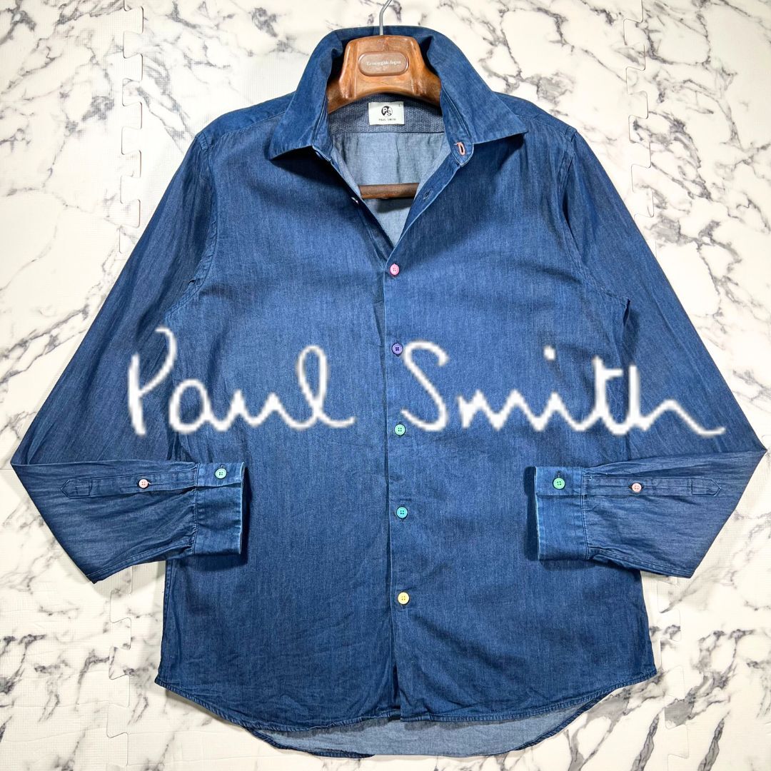 - 極美品/カラーボタン(L)●Paul Smith ポールスミス 長袖 デニム シャツ インディゴ ネイビー 濃紺 カジュアル コットン メンズ 無地 秋冬