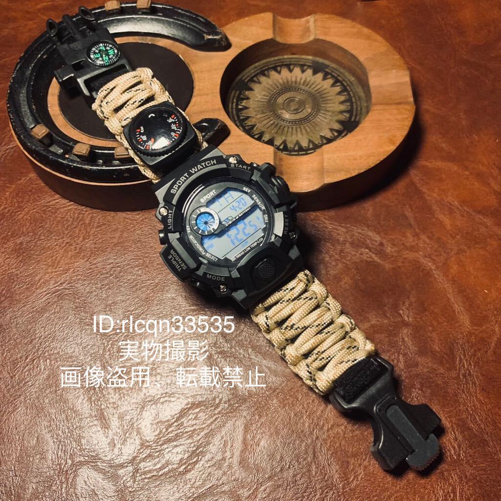 - アウトドア用 多機能 腕時計 温度表示 コンパス 火起こし棒 ホイッスル付き 釣り キャンプ 野外登山