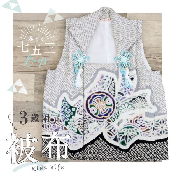 > 【七五三 子供用 被布 男の子】 グレー 鹿の子 総絞り 熨斗目 金駒刺繍 束ね熨斗『新品』 2歳 3歳 コート 飾り紐付き こども 男児 k25-85
