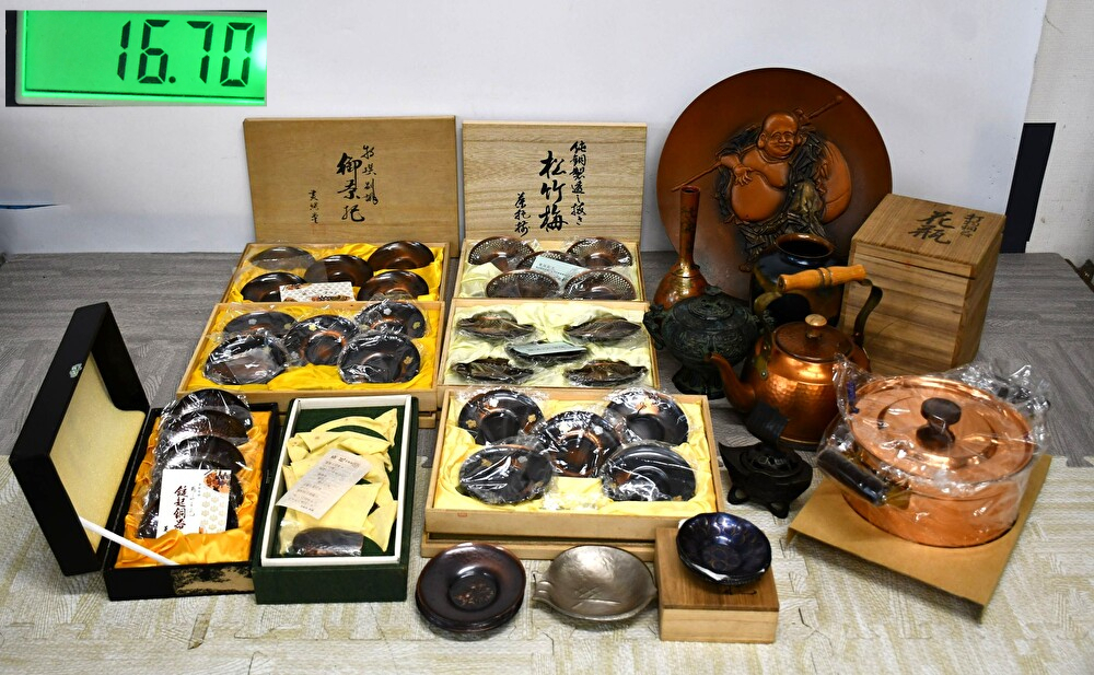 - PY9-87 銅製品 50点以上まとめ 茶托 茶匙 花瓶 花器 茶道具 壺 飾り壷 飾皿 鍋 薬缶 英純堂 海玉堂 栄美堂 乙信作 他 現状品