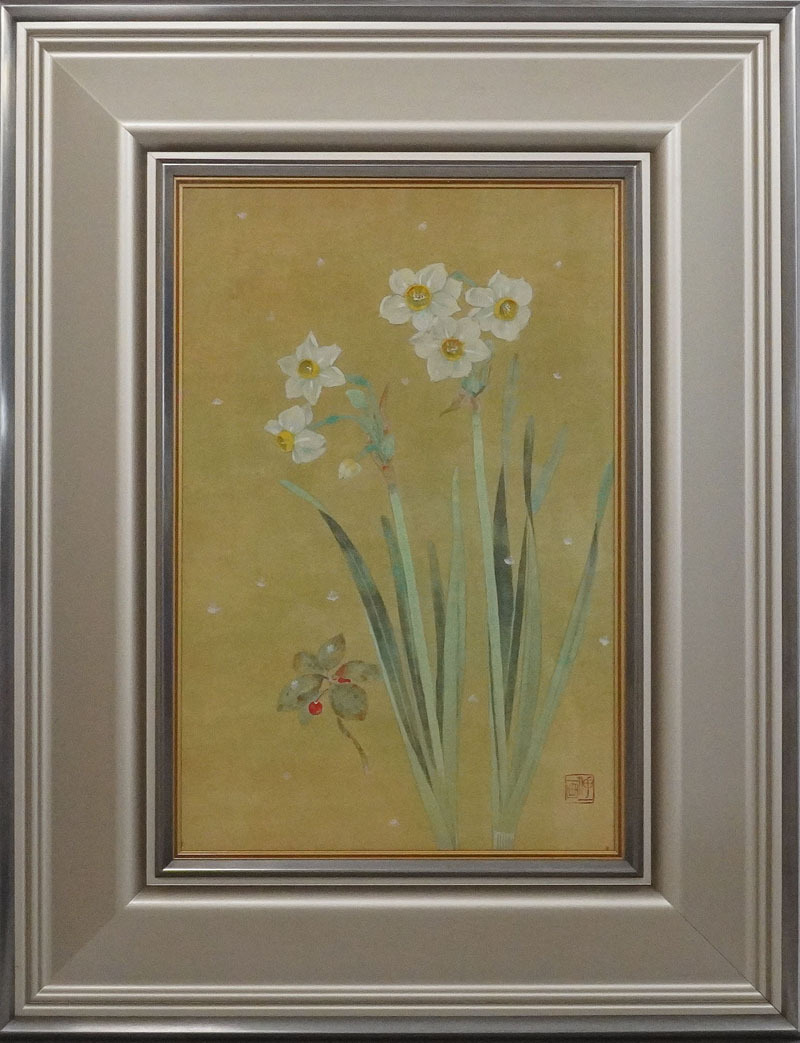 - 【J115】真作保証 郡司伸一 「雪中花」 日本画 6号 共シールあり タトウ箱 元美術文化会員 栃木県出身