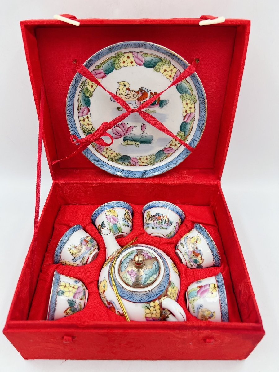 - 1円~中国茶器セット ミニ茶道具 ミニチュア 急須 湯呑み茶碗6客揃え ポット 盆皿 陶器 ケース付き 現状保管品