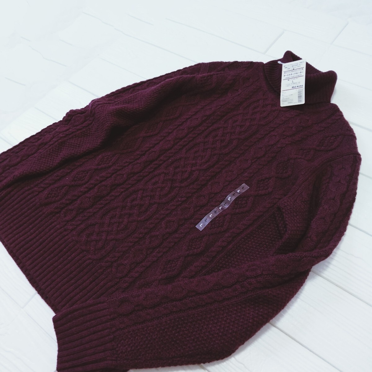 > 未使用*無印良品*首のチクチクをおさえたタートルネックセーター*アラン柄ニット*バーガンディ*レディースL*ウール100%*洗える
