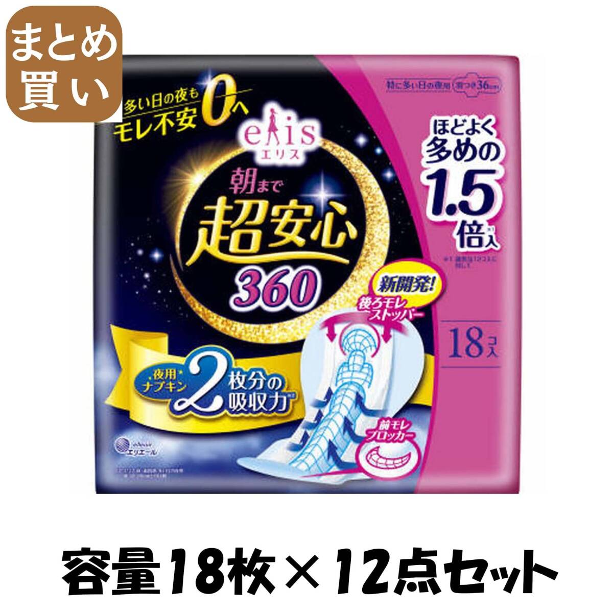 > 【まとめ買い】エリス 朝まで超安心360 特に多い日の夜用 36cm 羽つき ほどよく多めの18枚入 容量18枚×12点セット生理用品