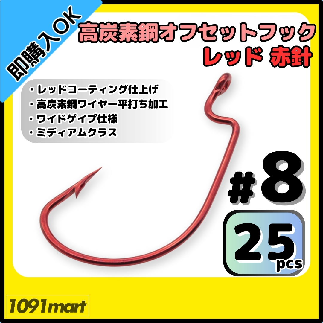 > 【送料無料】高炭素鋼 オフセットフック レッド赤針 #8 25本セット レッドコーティング仕上げ ワームフック テキサスリグ等様々なリグに!
