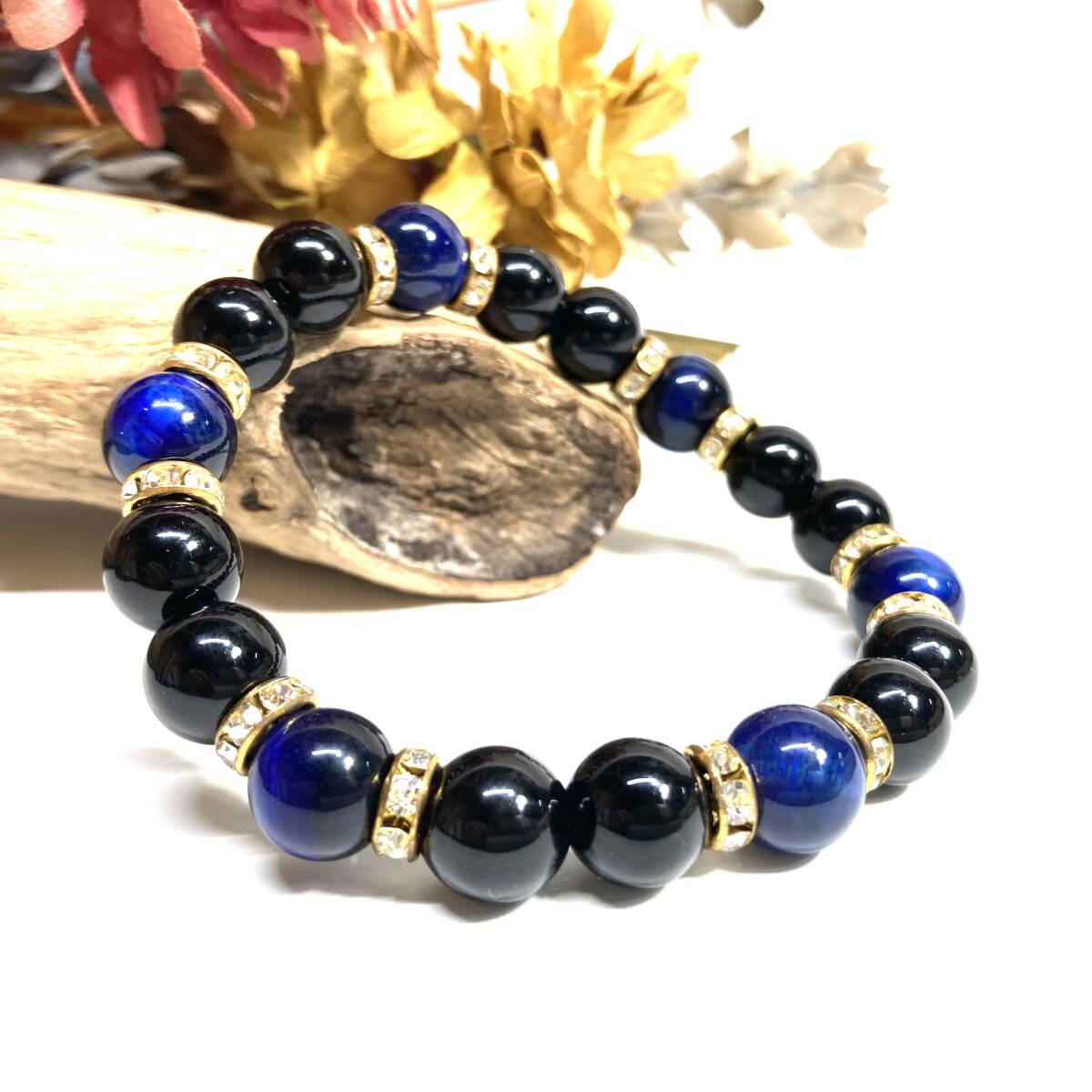 > モリオン&ブルータイガーアイ パワーストーン ブレスレット 天然石ブレス (ゴールド) 10mm メンズ・レディース 厄除け 金運 ☆