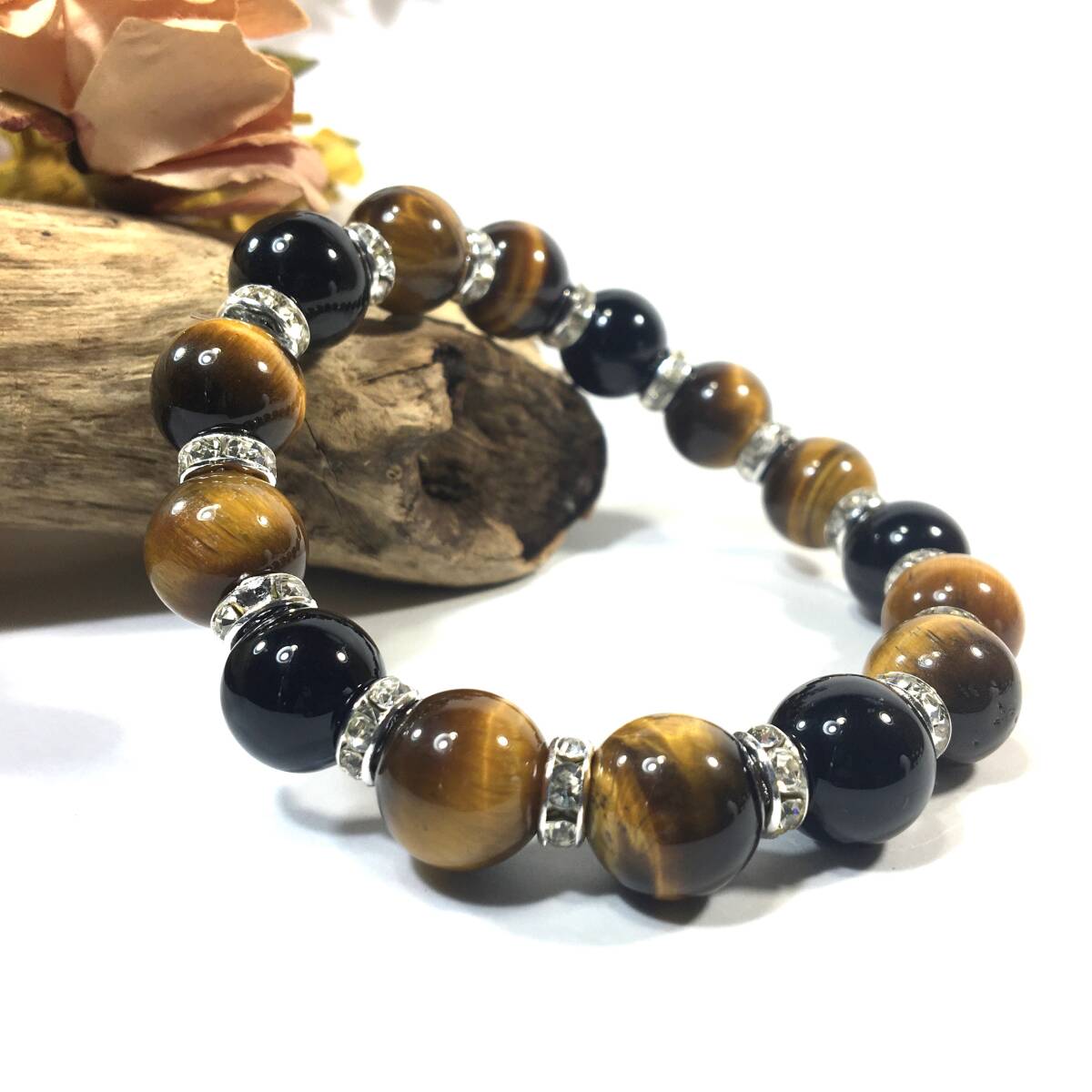 - タイガーアイ&オニキス パワーストーン ブレスレット 天然石ブレス (シルバー) 12mm 幸運 開運 メンズ 男性♪