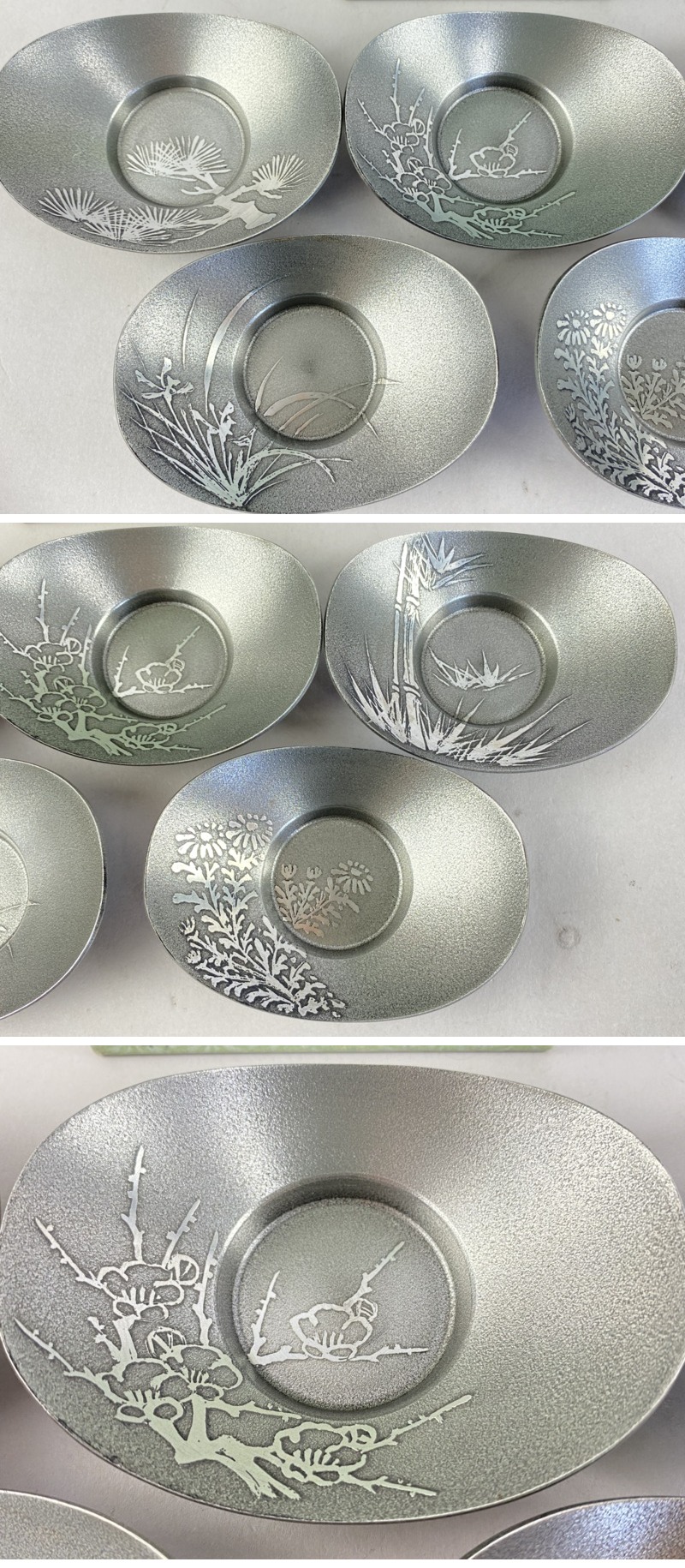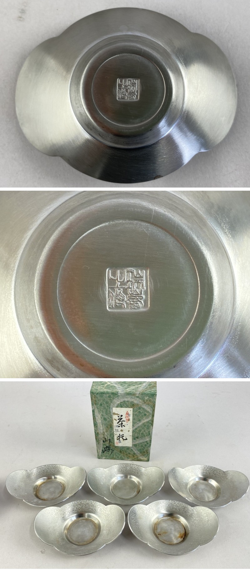 > ac462 茶托 まとめて 20客 秀峯堂 瑞峯堂 乾茂號造 在銘 托子 錫 白銀 花形 小判形 松竹梅蘭菊 煎茶道具 茶器