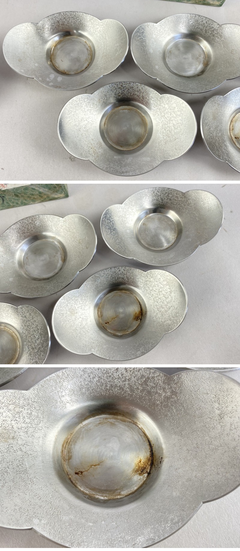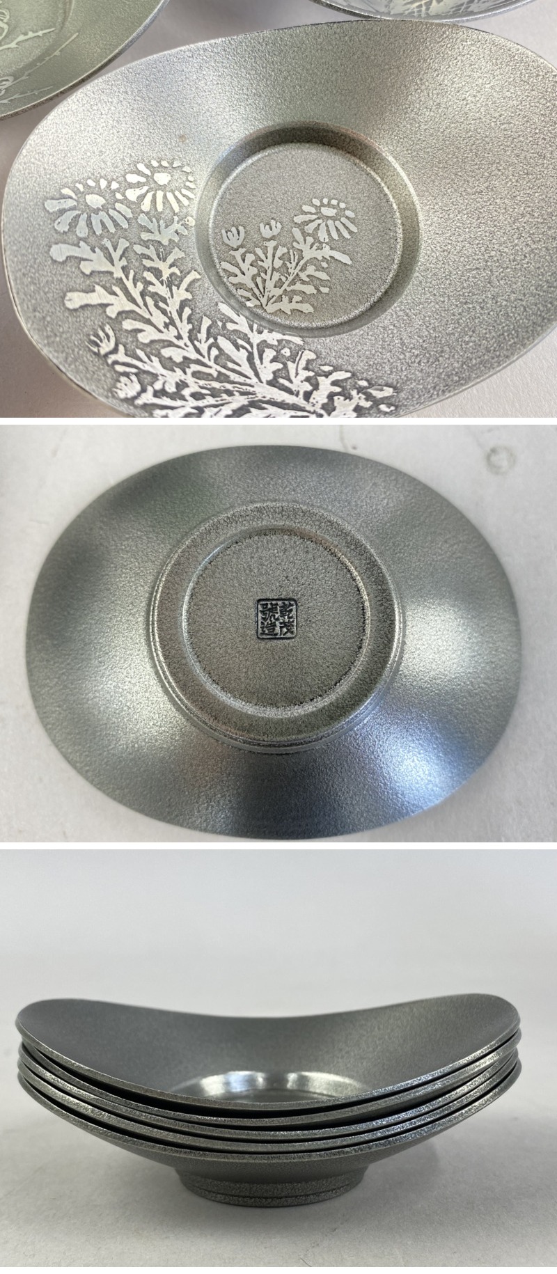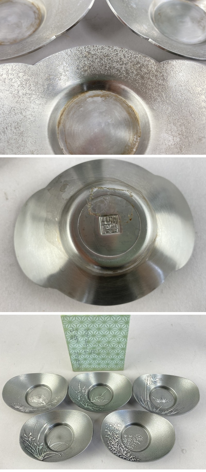- ac462 茶托 まとめて 20客 秀峯堂 瑞峯堂 乾茂號造 在銘 托子 錫 白銀 花形 小判形 松竹梅蘭菊 煎茶道具 茶器
