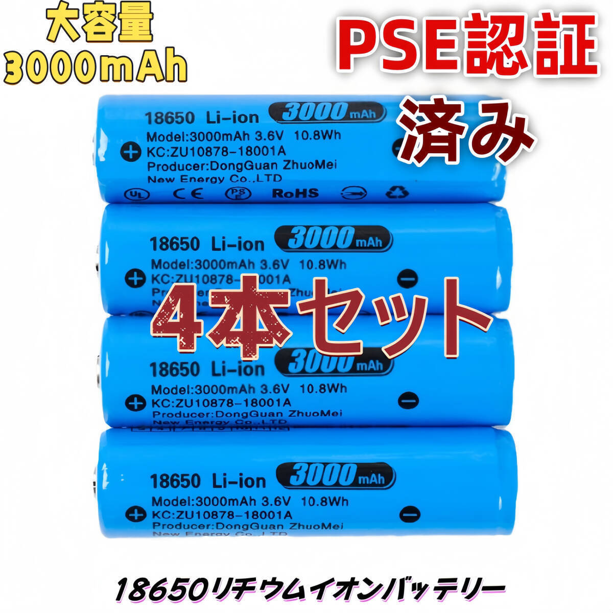 > 【4本セット】18650 リチウムイオン電池 バッテリー 大容量 3000mAh 3.6V 保護回路付 突起有り PSE認証済み