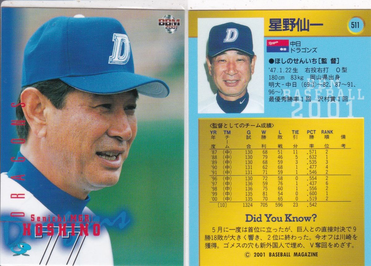 - ●2001BBM【星野 仙一監督】BASEBALL CARD No.511:中日 R9