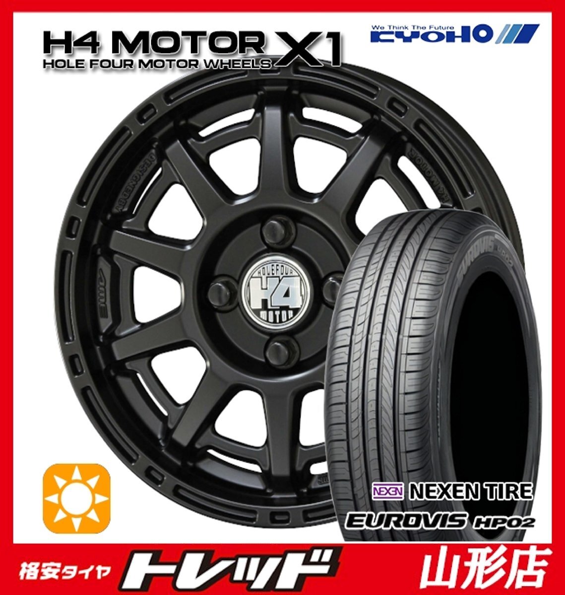 - 山形店★送料無料★新品夏タイヤホイール4本セット 共豊H4モーターX1 14インチ 4.5J 4H100 ロードストーン HP02 155/65R14 2025年 軽自動車