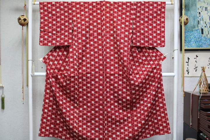 > きもの今昔9007 ウールきもの 毛100%染ウール バチ衿単衣手縫い仕立 エンジ色風車の柄 身丈145cm