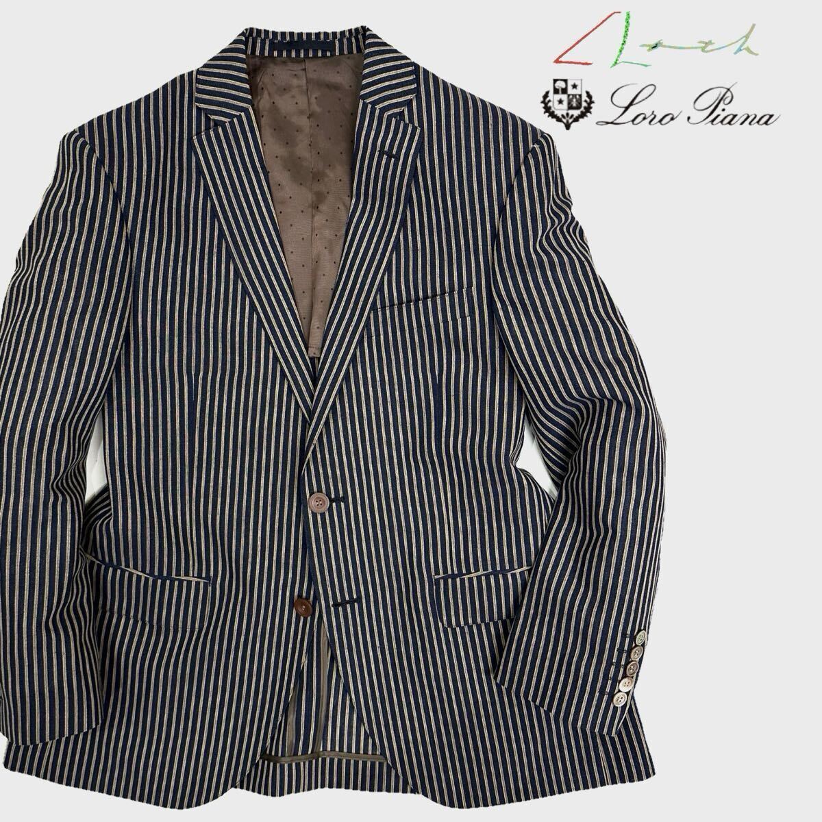 > 美品!! 日本製 Loro Piana ロロピアーナ 生地 ウール リネン 麻 2B ストライプ テーラード ジャケット ネイビー 紺色 メンズ 紳士服