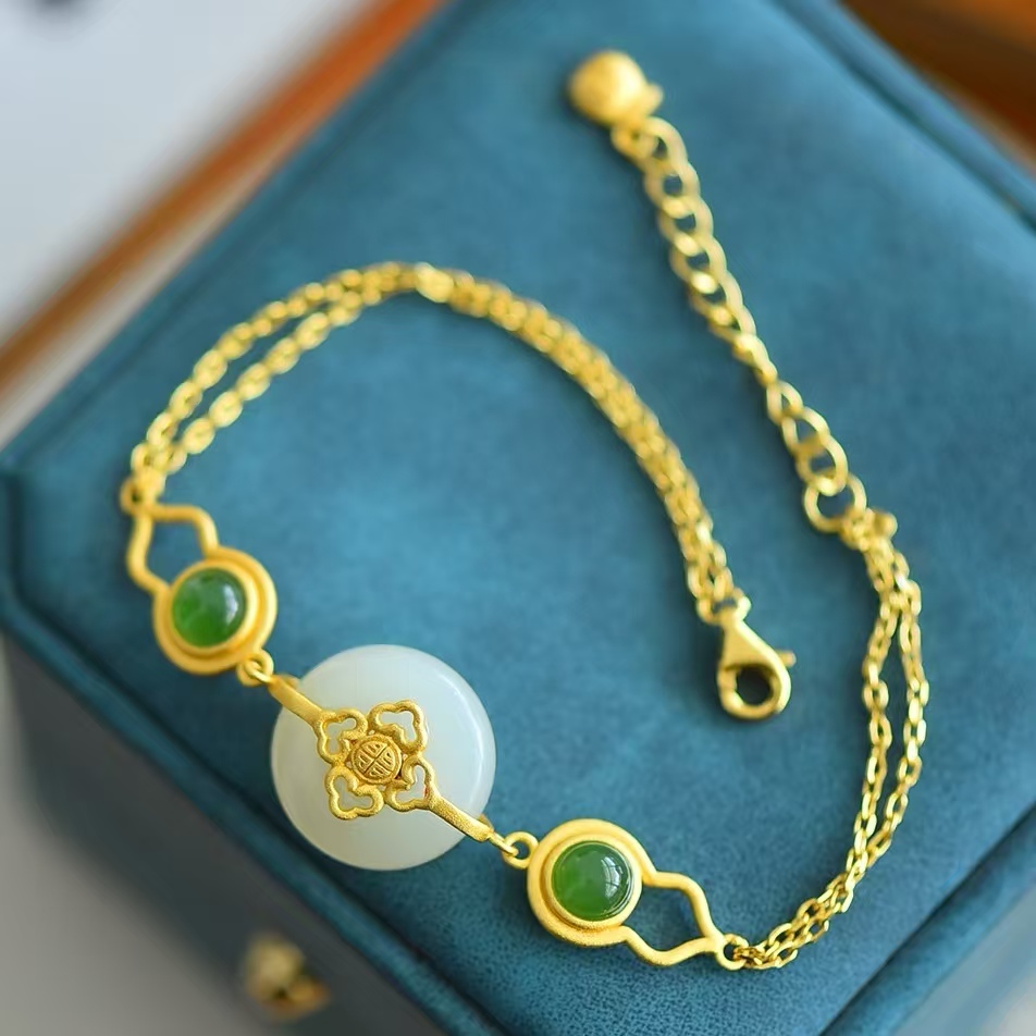 - 和田玉 早期收集 白玉彫 高氷 平安扣 手鏈 嵌金 吊墜 項鏈 首飾 箱有 時代物 古董品 骨董 旧家蔵出し 唐物 中国古玩 古美術品