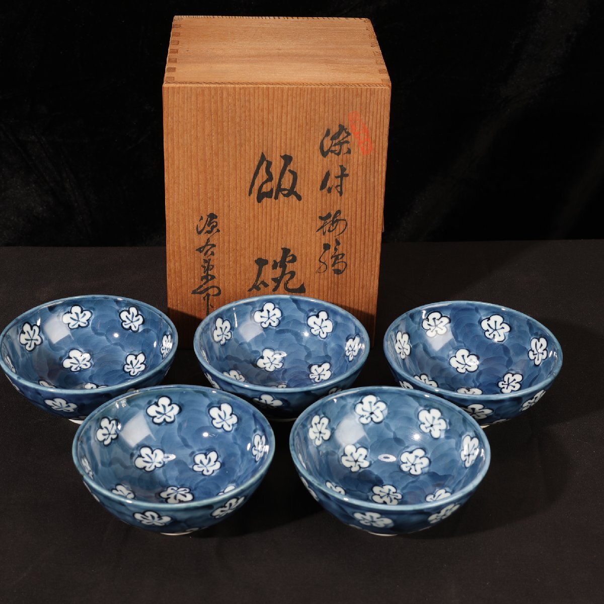 - 【珍品堂】1円から S84-V02 有田焼 源右衛門窯 染付 梅図 飯碗 5客 共箱 木箱 時代物 古美術 骨董品 アンティーク 昭和レトロ