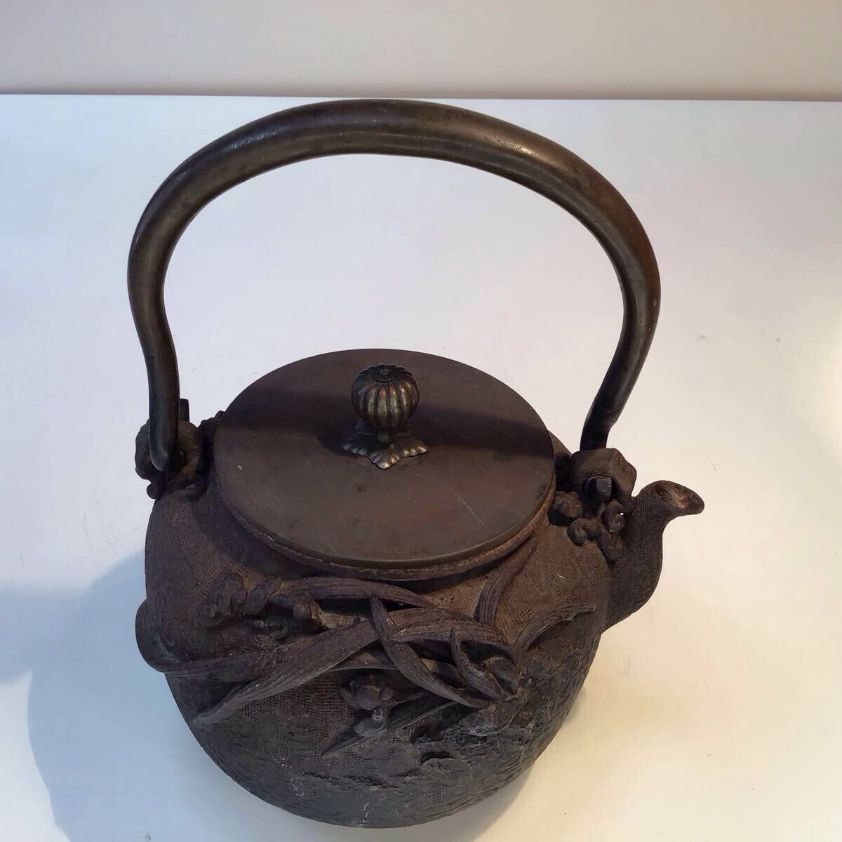 - 初旧家蔵出し 鉄瓶『日本亀文』 波多野正平造 蘭蟹紋布目浮彫 《拙家琵琶湖有東》底印 時代物明治期 古鉄 骨董 古美術品 茶道具