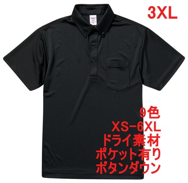 - ポロシャツ XXXL ブラック ボタンダウン 半袖ポロシャツ 半袖 ドライ素材 ドライ 無地 吸水 速乾 胸ポケット有 A618 3XL 4L 黒 黒色 592101
