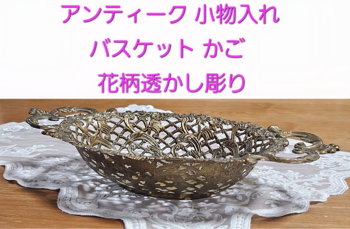 - アンティーク 真鍮 小物入れ バスケット かご 花柄透かし彫刻