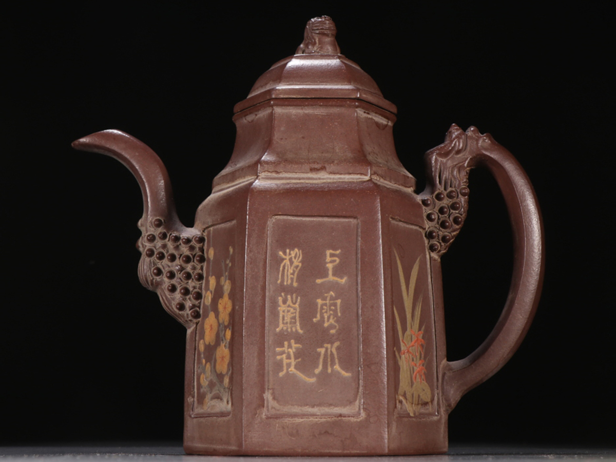 - ◆御泓軒◆『清時代 陳鳴遠銘 梅蘭竹菊紋六稜形茶壺 宜興紫砂 常滑 朱泥急須 煎茶道具 茶壷 』極細工・古賞物・中国古玩・中国古美術