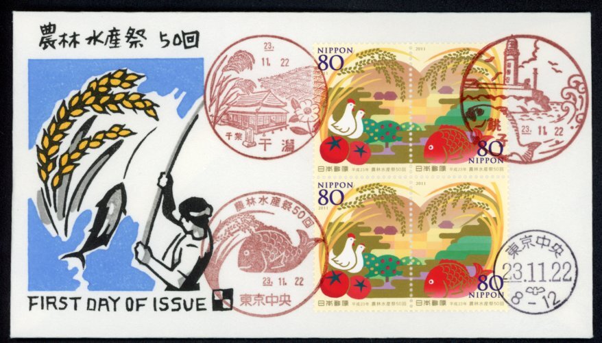 - 1107 【FDC】農林水産祭50回[干潟、銚子、東京中央/23.11.22/渡辺版](解説書なし)