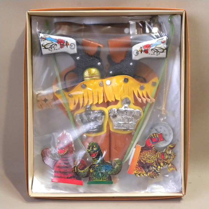> 【未使用 新品】1970年代 当時物 ガンファイター 二丁拳銃 怪獣 射的 ( 古い 昔の ビンテージ 昭和レトロ 西部劇 玩具 おもちゃ 駄玩具 )